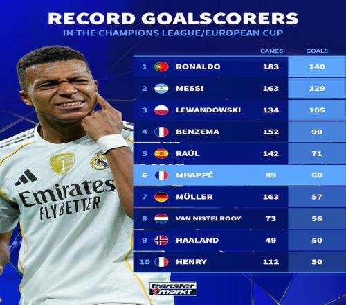 姆巴佩也憑借此帽子戲法使得個(gè)人歐冠進(jìn)球數(shù)來(lái)到60粒,超越穆勒,僅次于C羅、梅西、萊萬(wàn)、本澤馬和勞爾。賽后歐冠官方社媒也對(duì)姆巴佩表示了祝賀。