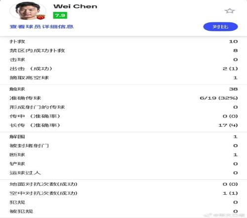 此役,海港隊(duì)統(tǒng)計(jì)數(shù)據(jù)全面落后,能收獲平局離不開(kāi)門(mén)將陳威的出色發(fā)揮,撲救次數(shù)達(dá)到驚人10次。