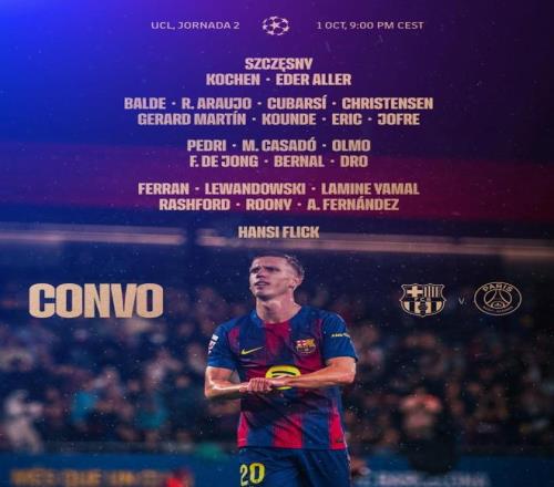 雷速體育10月1日宣 歐冠第二輪,巴薩vs巴黎。賽前,巴薩公布本場(chǎng)比賽大名單。