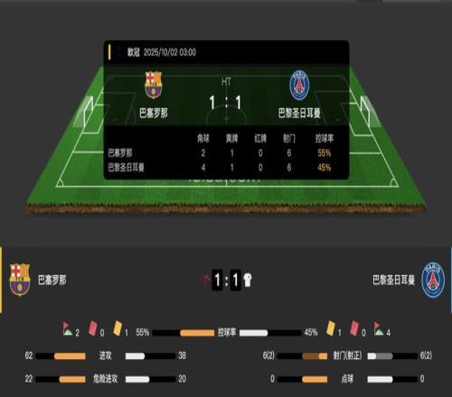 巴薩vs巴黎半場數(shù)據(jù):雙方均6次射門2次射正,控球率巴薩領(lǐng)先