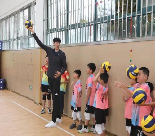 活動(dòng)的高潮,是張哲嘉老師帶來的 “冠軍體育課”。他沒有直接開始訓(xùn)練,而是先幫同學(xué)們梳理基礎(chǔ):“練排球先練‘腳’,腳步要先到位,走到接球的位置,再伸手去接,千萬別急著抬手?!?隨后,他親自示范顛球、接球、發(fā)球的動(dòng)作,手把手糾正同學(xué)們的姿勢(shì) —— 有的同學(xué)顛球總掉,張老師就蹲下來教他調(diào)整手型;有的同學(xué)發(fā)球沒力氣,他就指導(dǎo)如何借助身體的力量。最后,張老師還組織同學(xué)們模擬比賽陣型,練習(xí) “一傳、二傳、扣球” 的配合,盡管同學(xué)們的動(dòng)作還略顯青澀,但每一個(gè)人都全情投入,操場(chǎng)上滿是笑聲與汗水交織的美好畫面。