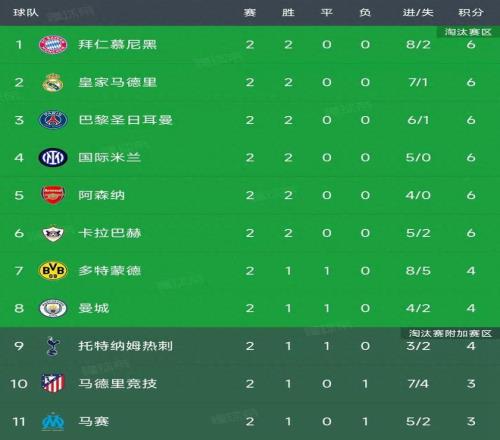 歐冠第二輪結(jié)束了所有比賽,最新積分榜如下!