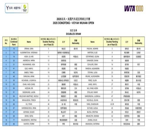 巴黎奧運(yùn)會女雙金牌得主、今年法網(wǎng)女雙冠軍埃拉尼/保利尼領(lǐng)銜出戰(zhàn)武網(wǎng)女雙,中國金花張帥將攜手前女雙“球后”梅拉德諾維奇亮相,謝淑薇/奧斯塔彭科、安德列娃/施耐德等組合也頗具看點(diǎn)。
