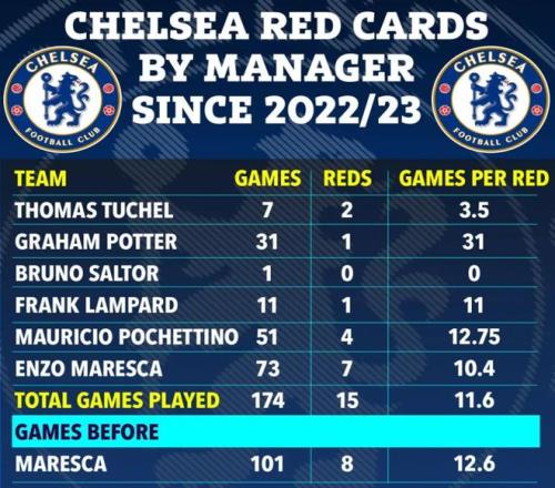 這一數(shù)據(jù)甚至比2022年切爾西現(xiàn)任管理層接手后球隊的整體紅牌率(每11.6場1張)還要糟糕,也比馬雷斯卡上任前球隊“每12.6場1張紅牌”的表現(xiàn)進一步惡化。