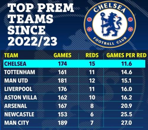 《太陽報》統(tǒng)計的數(shù)據(jù)顯示,自2022-23賽季以來,切爾西在英超頂級俱樂部中的紅牌紀(jì)錄最為糟糕。