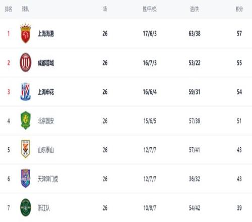 在積分榜上,上海海港以57分高居榜首。排名第2的是成都蓉城,拿到55分,落后2分,依然有奪冠的希望。上海申花54分排名第3。第4的是北京國(guó)安,拿到51分,落后榜首6分,爭(zhēng)冠希望渺茫。而山東泰山拿到平局之后,總積分是43分,升到第5名。天津津門虎也是43分,排名第6。第7的浙江隊(duì)拿到39分。