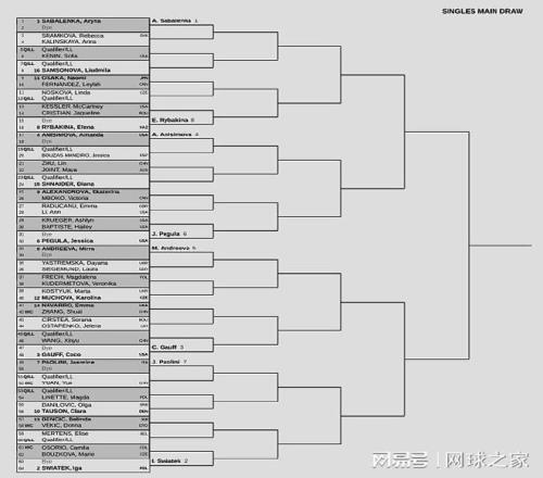 我們?cè)賮?lái)關(guān)注武網(wǎng)。北京時(shí)間昨天下午,WTA1000武網(wǎng)公布了正賽簽表。女單前八種子對(duì)位:上半?yún)^(qū),薩巴倫卡一萊巴金娜、阿尼西莫娃-佩古拉;下半?yún)^(qū),高芙-米拉-安德列娃、斯瓦泰克-鮑里妮。中國(guó)球員方面:張帥VS納瓦羅、朱琳VS喬恩特、王欣瑜和袁悅VS資格賽球員。