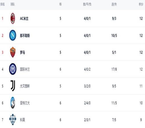 在積分榜上,榜首易主,國際米蘭以12分登上了榜首位置。還有3支球隊也是12分,但凈勝球不如國際米蘭。AC米蘭、那不勒斯和羅馬排名第2到第4,這些球隊都比國際米蘭少踢1輪。尤文圖斯以11分排名第5。亞特蘭大只拿到10個積分,排名第6??颇⑺_索洛和克雷莫內(nèi)塞都是9個積分。而拉齊奧只拿到7分,排名第10。