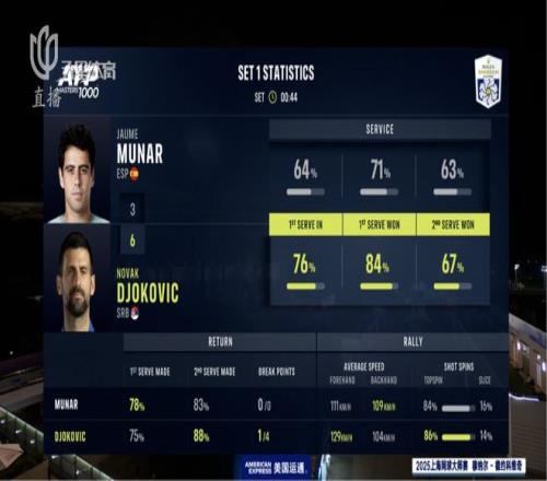 而在自己的接發(fā)輪,德約科維奇也不想與穆納爾做過(guò)多纏斗,主動(dòng)變線進(jìn)攻,每一分的回合數(shù)都在三拍左右。首盤6比3,德約耗時(shí)50分鐘,1比0取得領(lǐng)先,這一盤中,塞爾維亞名將在自己的發(fā)球局總共就丟了5分。