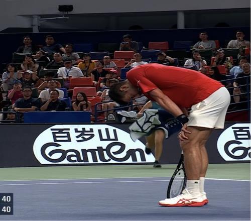 短暫的休息后,38歲的老將依然選擇繼續(xù)戰(zhàn)斗,但是體能已經(jīng)亮起了紅燈。幾乎每打完一分,德約就需要雙手撐著膝蓋緩上一口氣。