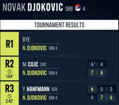 前兩輪,德約科維奇分別戰(zhàn)勝克羅地亞老將西里奇以及德國(guó)選手漢夫曼,但兩場(chǎng)比賽加起來(lái)耗時(shí)接近5個(gè)小時(shí),體能對(duì)于38歲的德約來(lái)說(shuō)是個(gè)不小的考驗(yàn)。