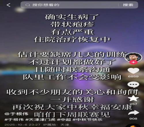 對(duì)此,于根偉本人昨天深夜在社交媒體回應(yīng):確實(shí)生病了,帶狀孢疹,有點(diǎn)嚴(yán)重。住院治療恢復(fù)中。估計(jì)要缺席幾天的訓(xùn)練,不過計(jì)劃都做好了,且隨時(shí)聯(lián)系溝通,隊(duì)里工作不會(huì)受影響。收到不少朋友的關(guān)心和詢問,一并感謝。再次祝大家中秋幸福安康,咱們下周聯(lián)賽見。