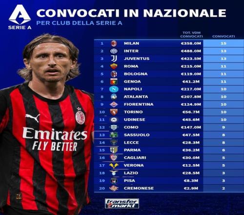 北京時(shí)間10月8日,德轉(zhuǎn)統(tǒng)計(jì)出了意甲球隊(duì)本月國際比賽日被征召的球員人數(shù),AC米蘭15人得到征召排名第一,國際米蘭和尤文圖斯則各有13人入選國家隊(duì)。