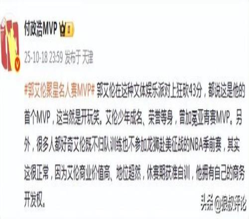 郭艾倫在杭州名人賽獨(dú)砍43分收獲MVP引發(fā)外界的熱議,這種以?shī)蕵?lè)性質(zhì)為主的比賽,郭艾倫是少數(shù)不多的現(xiàn)役球員,他拿到MVP并不意外。