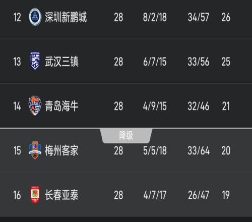 在還剩2輪的情況下,青島海牛以21分暫逃離降級區(qū),積20分的梅州客家和19分的長春亞泰降級區(qū)。
