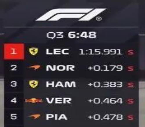 最后一個(gè)飛行圈!諾里斯火力全開(kāi)狀態(tài)奇佳,最終以1:15.586獲得第一拿到桿位!而他的隊(duì)友卻在第三計(jì)時(shí)段出現(xiàn)失誤,僅以1:16.174的成績(jī)排在第八名。法拉利表現(xiàn)出色,兩位車(chē)手勒克萊爾和漢密爾頓都順利進(jìn)入1分16秒關(guān)口位列第二和第三名。