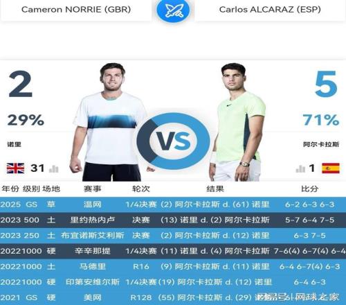 2023年之后,隨著年事漸高、傷病侵襲,諾里狀態(tài)起伏、戰(zhàn)績(jī)下滑,世界排名緋徊在第30位左右。職業(yè)生涯至今,諾里與阿爾卡拉斯交鋒七次,取得兩勝五負(fù)的戰(zhàn)績(jī)。相比其他高排位選手,諾里這個(gè)戰(zhàn)績(jī)已經(jīng)殊為難得了。這說(shuō)明諾里技戰(zhàn)術(shù)水平仍在,猶有一戰(zhàn)之力,讓誰(shuí)也不敢等閑視之。