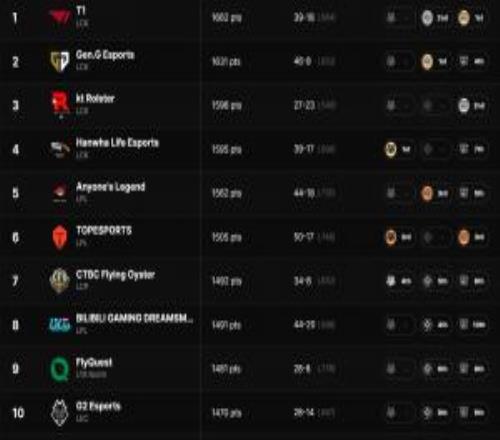 拳頭官方更新全球戰(zhàn)力排行:T1第一LCK包攬前四AL第五