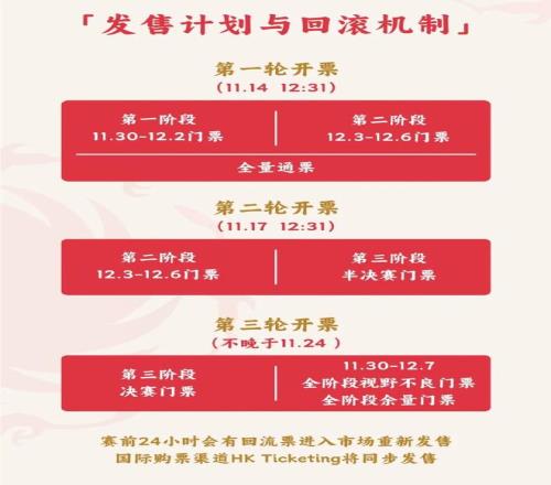 第二輪次門票將于11月17日開售,計(jì)劃釋放剩余循環(huán)賽門票以及60%半決賽場(chǎng)次門票;第三輪次門票將不晚于11月24日開售,預(yù)計(jì)釋放所有場(chǎng)次視野遮擋門票、剩余半決賽門票以及全部決賽門票。