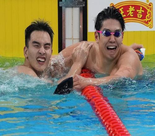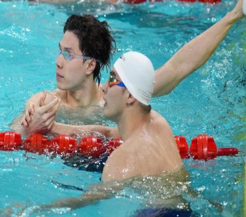 11月12日,上海隊(duì)選手覃海洋(左)與隊(duì)友鄭英昊在男子50米蛙泳半決賽后握手致意。