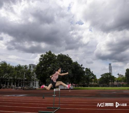 莫家蝶進行跳欄專項技術動作練習。