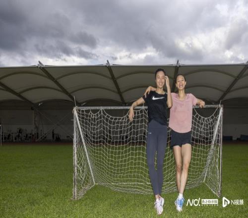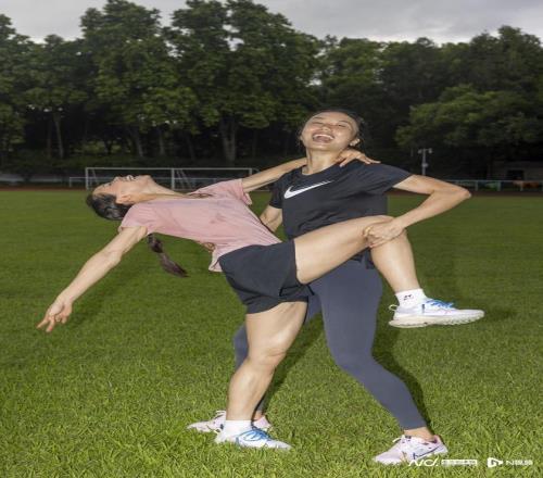訓練結束,在田徑場跑道中間的草地上散步調整,莫家蝶與隊友曾蕊應記者的要求合照,笑得開懷。