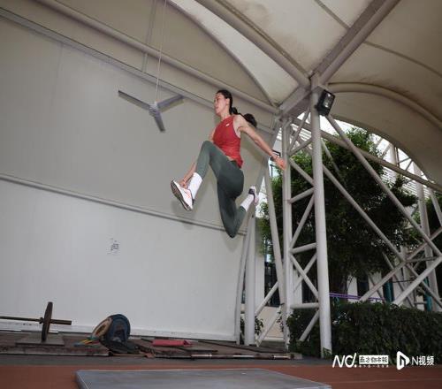 在訓練場器械區(qū),莫家蝶進行自我訓練,跳起來騰空相當高。