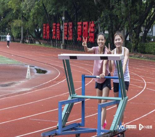 在跑道上,隊友孔瑩鎣與莫家蝶經常一起推車擺跳欄,進行技術訓練。