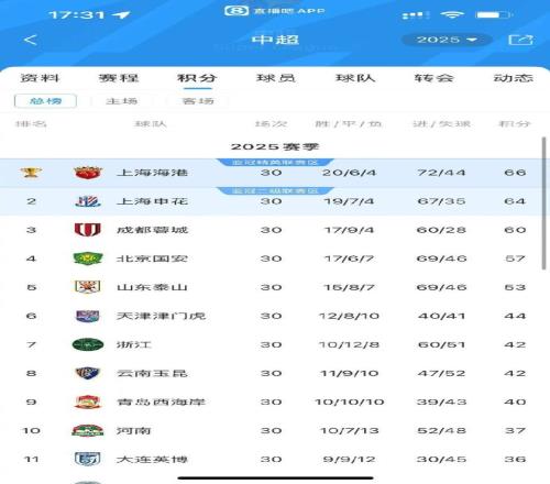 2025中超落幕!排名奇觀:前7和上賽季完全一致
